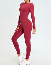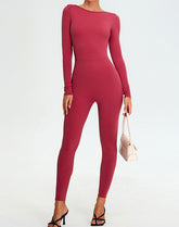 Turn heads with the Long Sleeve Backless Workout Jumpsuit One Piece Bodysuit. The striking backless design offers both ventilation and a bold, fashionable look. Paired with long sleeves and a slim fit, this jumpsuit creates a sleek and feminine silhouette suitable for both workouts and casual outings.