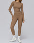 This activewear set combines a slim-fit long sleeve top with high-waisted leggings. The design offers full coverage while ensuring breathability and style.