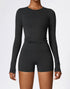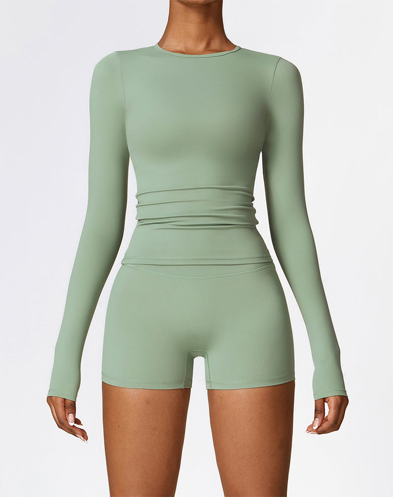 This two-piece set features a long-sleeve slim-fit T-shirt and high-waisted shorts. Combining coverage and flexibility, it’s perfect for transitional seasons.