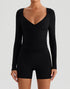 This slim fit long sleeve top is designed with a sweetheart neckline for a feminine touch. The fitted silhouette and thumb holes make it both stylish and practical for cooler days.