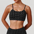 Shine through every workout with the Silver Polka Dot Sports Bra with Removable Bra Pads. Designed with eye-catching silver polka dots and adjustable crisscross back straps, this sports bra combines style, support, and flexibility—perfect for both training sessions and everyday athleisure wear.