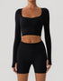 A modern yoga crop top that combines style and function. Featuring a square V-neck, double waist pleating, and a built-in bra pad, this design enhances both support and aesthetics.