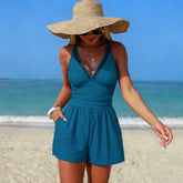 Stay stylish and practical with the V Neck One Piece Swimsuit Romper with Shorts and Pockets. Designed with a flattering V-neckline and a one-piece romper silhouette, this swimwear piece combines feminine style with everyday functionality. Adjustable shoulder straps ensure a comfortable, customized fit, while the built-in shorts with side pockets add convenience for active days by the water.