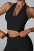 This V neckline yoga crop tank top delivers both elegance and functionality. Featuring a flattering V-neck cut, halter neck design, and built-in bra pad, it supports your every move with comfort and confidence.
