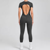 Achieve elegance and functionality in one with the short sleeve backless yoga jumpsuit—your go-to for stylish performance.